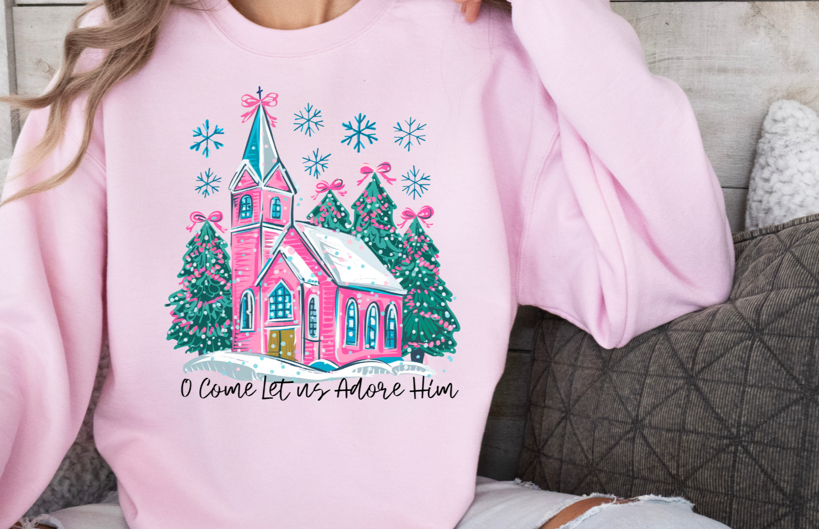 Pink Christmas Sweatshirt – "O Come Let Us Adore Him" | Cozy Holiday Christian Apparel